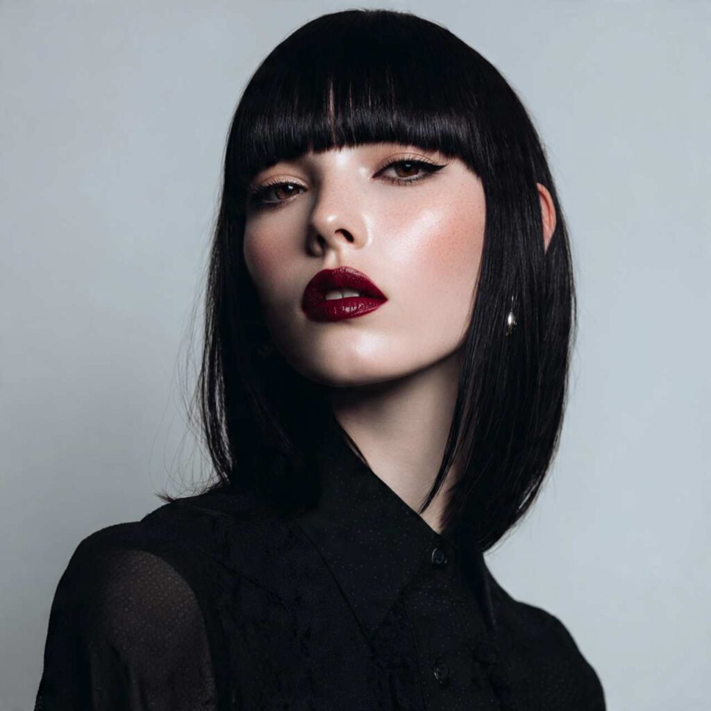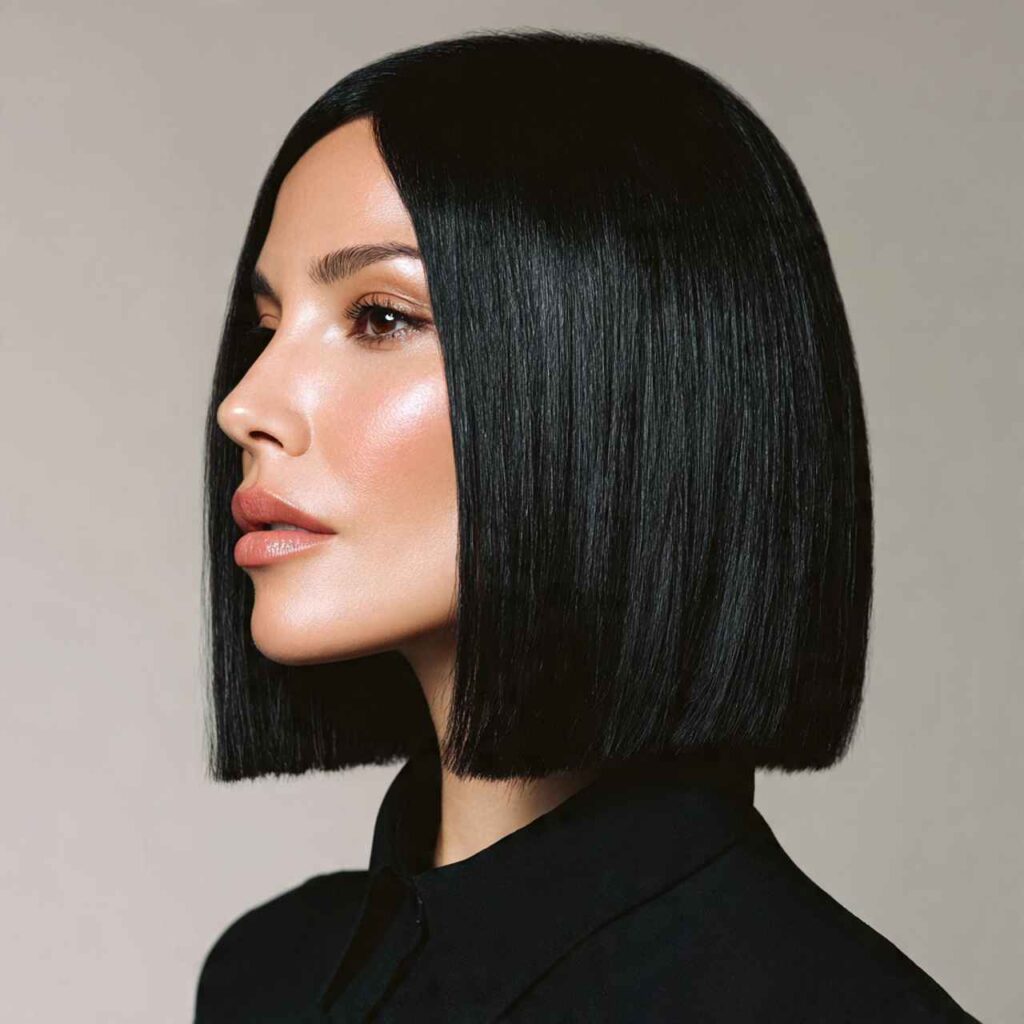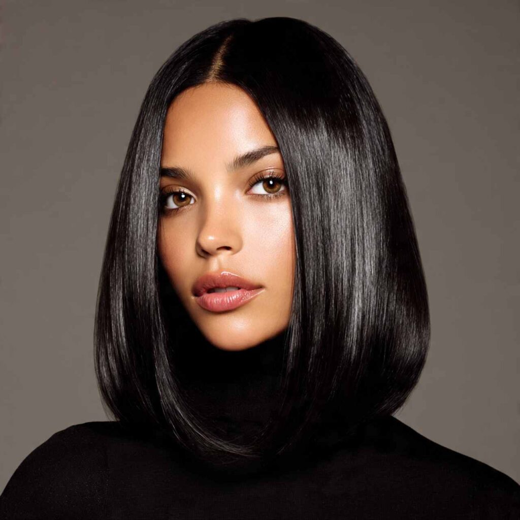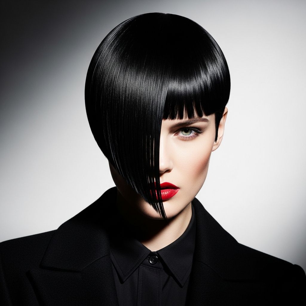 A sleek, shiny bob styled to perfection with glossy finish that reflects light like glass. The cut is precision-perfect with not a hair out of place. Sophisticated and polished.
