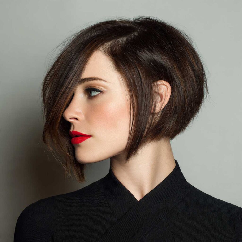 An ultra-short bob that sits above the chin, often styled sleek and straight with a deep side part. This bold cut makes a statement and works beautifully on fine to medium hair textures.
