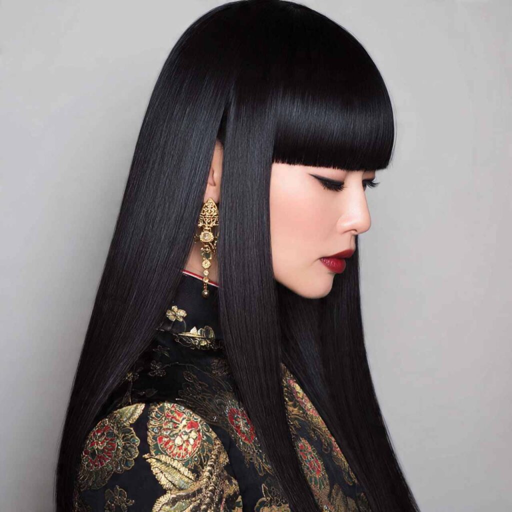 A Japanese-inspired cut featuring blunt, straight-across bangs, cheek-length face-framing pieces, and long hair in back. The geometric precision creates a distinctive, fashion-forward look.