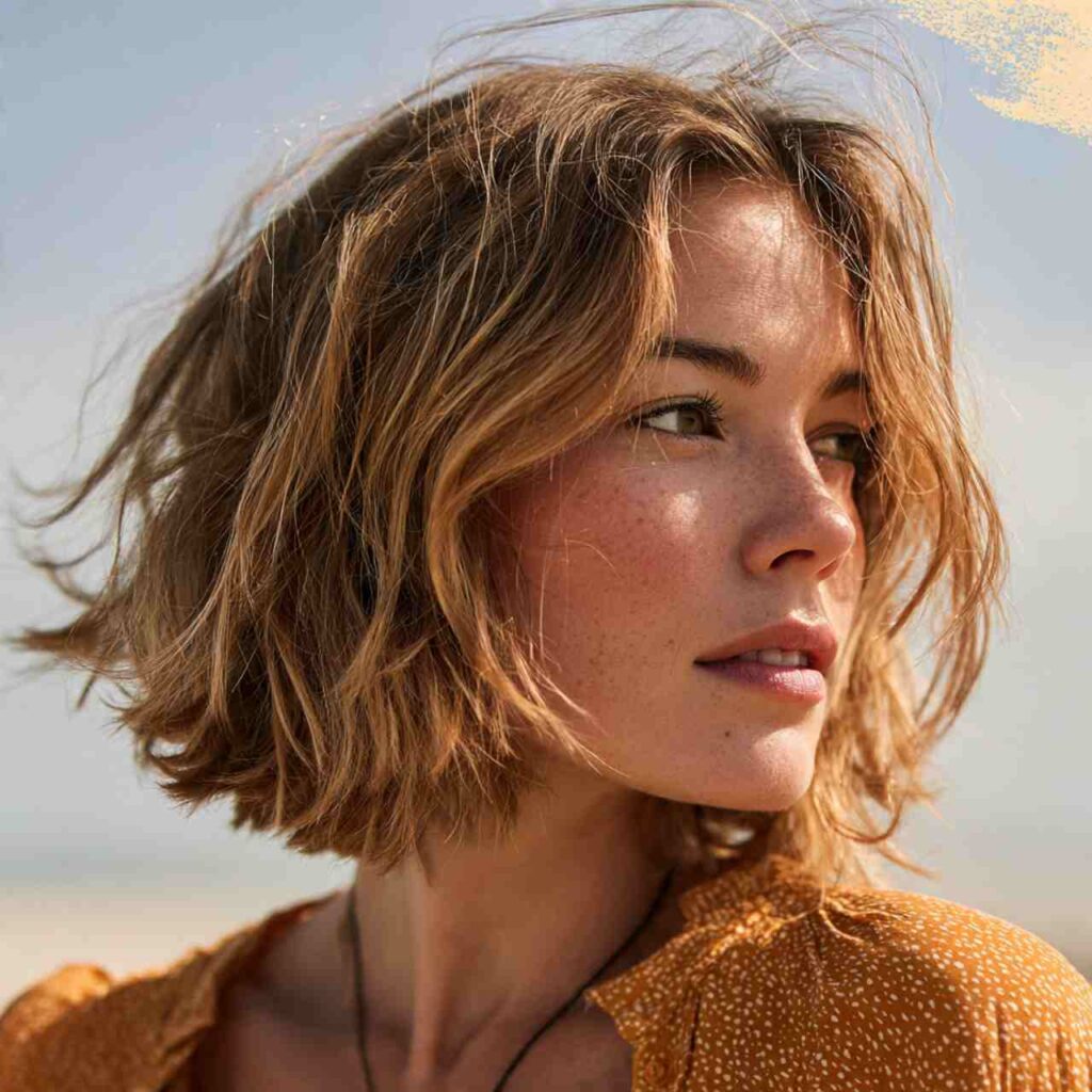 A chin to shoulder-length bob specifically cut and styled to create natural-looking, lived-in waves. The cut works with natural texture to create effortless beachy movement.