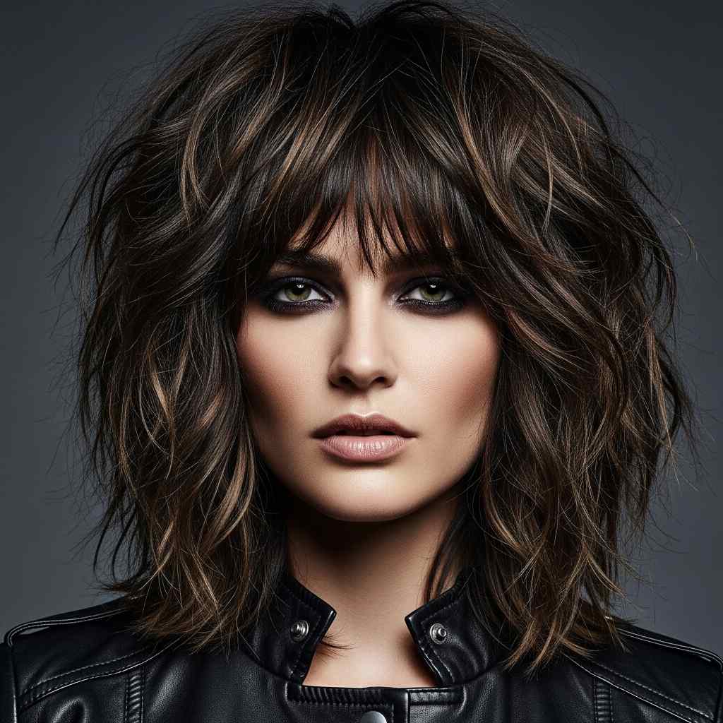 A shoulder-length cut loaded with choppy layers throughout creates modern shag energy. Bangs are optional but recommended either curtain bangs or wispy fringe. The overall effect is effortlessly cool and rock-and-roll inspired.