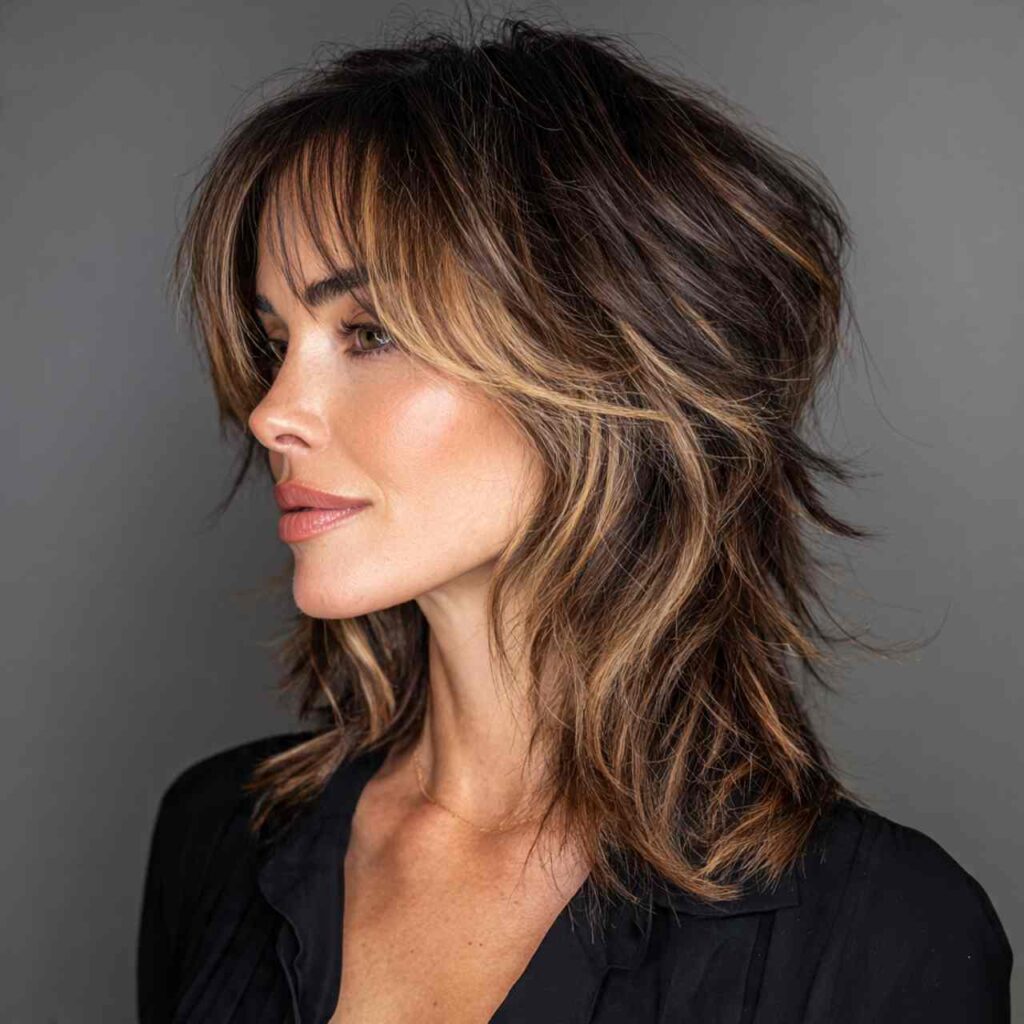 A shoulder-length shag with dimensional coloring balayage, ombrรฉ, or highlights that emphasizes the layered texture. The color and cut work together to create maximum depth and movement.
