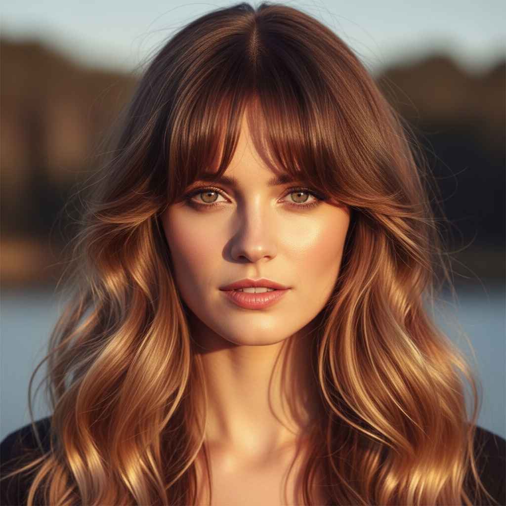 Slightly curved bangs that are narrower at the forehead and wider near the cheekbones, creating a bottleneck shape that beautifully frames the face. Works with all lengths and hair types.