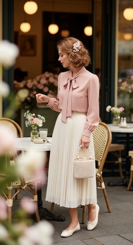 A blush ribbon-tie blouse paired with a cream pleated midi skirt creates romantic coordination for feminine summer days. The delicate ribbon bow adds sweet detailing while the pleated skirt provides graceful movement with every step. Style with ballet flats and a pearl-handle bag for polished daytime elegance. Add a floral hairpin and soft curls for cohesive romantic styling. This combination celebrates classic femininity with modern sensibility. Perfect for afternoon teas or garden visits.