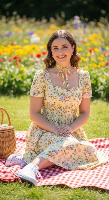 A ditsy floral tea dress in soft yellow creates cheerful vintage charm for sunny summer outings. The tiny floral print feels playful yet polished while the button-front design allows adjustable comfort. Pair with white canvas sneakers and a basket bag for casual feminine styling. Add a ribbon choker and loose waves for sweet retro appeal. This dress captures carefree summer joy with timeless elegance. Ideal for picnics or countryside adventures.