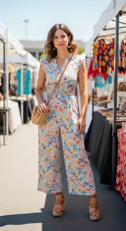 A floral jumpsuit with a smocked waist in soft pastels creates comfortable femininity for summer adventures. The smocked detailing ensures a flattering fit while the wide legs provide breezy movement and style. Style with wedge sandals and a woven crossbody for versatile daytime elegance. Add hoop earrings and loose waves for relaxed romantic appeal. This one-piece wonder simplifies dressing while delivering maximum feminine charm. Perfect for festivals or outdoor markets.