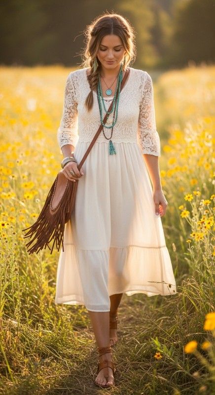 A cream peasant dress with delicate lace sleeves creates bohemian romance for relaxed summer days. The flowing silhouette ensures comfort while the lace detailing adds vintage-inspired femininity. Pair with leather sandals and a fringe bag for authentic boho styling. Layer turquoise jewelry and wear hair in loose braids for free-spirited refinement. This dress celebrates artisanal craftsmanship with effortless grace. Ideal for beach days or countryside explorations.