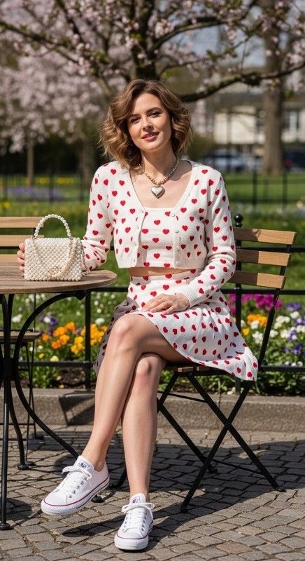 A white mini skirt with delicate heart prints paired with a matching cropped cardigan creates playful coordination for sweet summer days. The charming print adds youthful femininity while the lightweight knit ensures comfortable layering. Style with white sneakers and a pearl-embellished bag for casual chic appeal. Add a heart pendant and soft curls for cohesive romantic styling. This set celebrates love and joy with effortless style. Perfect for dates or friend gatherings.