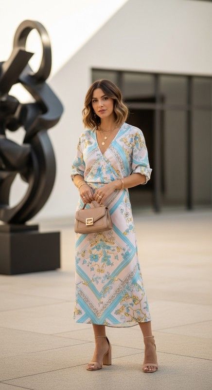 A midi dress featuring a soft silk scarf print in pastels creates artistic femininity for creative summer occasions. The flowing print adds visual interest while the lightweight fabric ensures comfortable movement throughout the day. Pair with nude block heels and a structured mini bag for polished daytime elegance. Add delicate gold jewelry and soft waves for refined romantic appeal. This dress celebrates artistry with wearable grace. Ideal for gallery visits or luncheons.