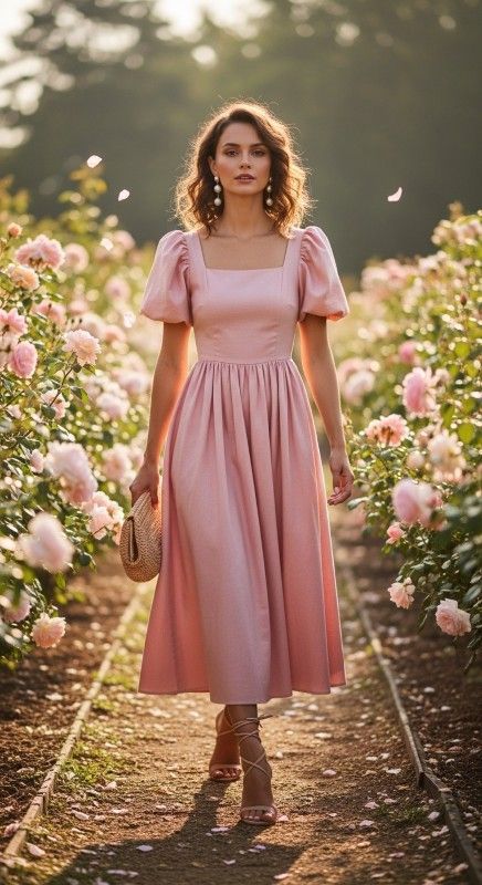 A blush pink midi dress with delicate puff sleeves creates romantic volume that flatters your shoulders while maintaining breezy comfort. The soft hue complements all skin tones and pairs beautifully with nude accessories for a cohesive, elegant look. Style with dainty pearl earrings and strappy sandals for garden parties or afternoon teas. Add a woven clutch and loose curls for that effortlessly feminine vibe. The midi length ensures versatility for both casual and dressy summer occasions. This dress captures timeless romance with a modern twist.
