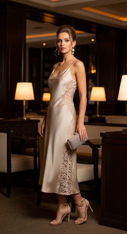 A champagne slip dress with delicate lace side panels creates subtle allure for elegant summer evenings. The sheer lace detailing adds romantic dimension while the silk fabric drapes beautifully on your frame. Pair with strappy heels and a crystal clutch for sophisticated nighttime styling. Add pearl earrings and an updo for refined glamorous appeal. This dress balances modesty and allure with timeless grace. Ideal for cocktail parties or special dates.