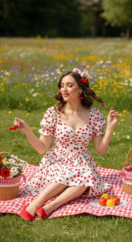 A white dress featuring delicate cherry prints creates playful sweetness for sunny summer picnics and casual outings. The charming fruit motif adds youthful femininity while the relaxed fit ensures comfortable movement throughout the day. Pair with red ballet flats and a woven basket bag for cohesive thematic styling. Add a cherry hair clip and natural makeup for sweet retro appeal. This dress celebrates summer’s joyful flavors with effortless charm. Perfect for park days or friend gatherings.
