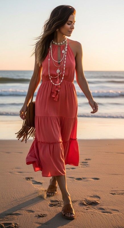 A coral halter dress with delicate tassel ties creates bohemian femininity for beachside adventures and casual celebrations. The adjustable tassel detailing adds artisanal charm while the flowing silhouette ensures breezy comfort in warm weather. Style with leather sandals and a fringe bag for authentic coastal styling. Layer shell jewelry and wear hair in loose waves for free-spirited refinement. This dress captures carefree summer energy with effortless grace. Ideal for beach clubs or sunset gatherings.