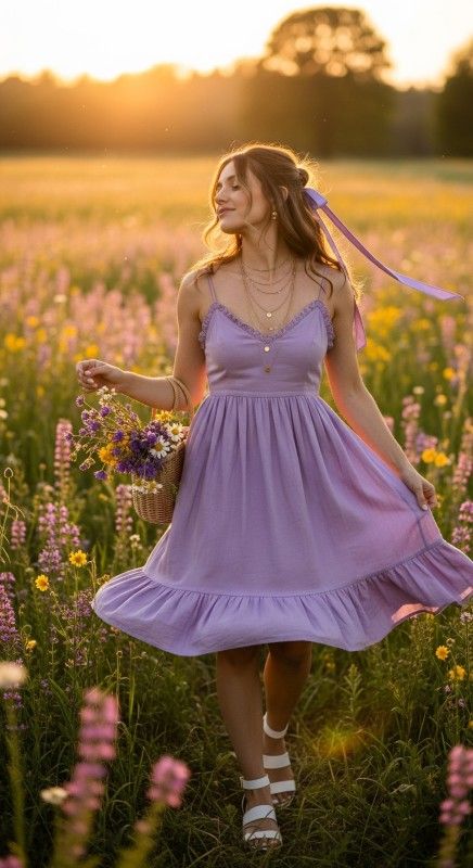A lavender sundress with cascading ruffle hems adds playful movement that dances with every step you take. The soft purple tone evokes calm elegance while the lightweight fabric keeps you cool during sunny days. Pair with white ankle-strap sandals and a mini basket bag for picnic-perfect styling. Layer delicate gold chains and wear hair in a half-up style for sweet refinement. This dress transitions beautifully from brunch dates to sunset strolls. Embrace your playful side with this charming summer essential.