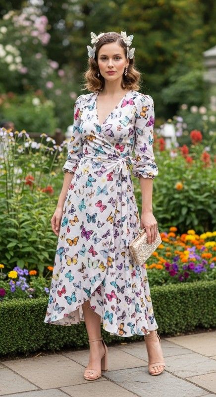 A wrap dress featuring delicate butterfly prints in soft pastels creates whimsical charm for summer celebrations. The adjustable wrap design ensures a flattering fit while the flowing silhouette moves gracefully in summer breezes. Pair with nude block heels and a beaded clutch for garden wedding guest style. Add butterfly hair clips and dewy makeup for cohesive thematic styling. This dress celebrates nature’s beauty while highlighting your feminine grace. Perfect for outdoor ceremonies or afternoon parties.