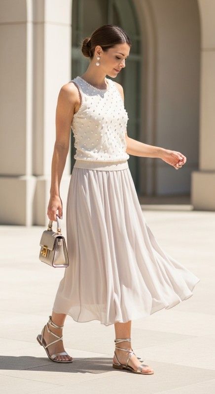 A simple ivory tank adorned with scattered pearl details paired with a flowing chiffon skirt creates understated luxury. The subtle embellishments catch light beautifully while the airy skirt ensures all-day comfort in warm weather. Style with metallic sandals and a structured mini bag for polished daytime elegance. Add pearl stud earrings and a sleek low bun for refined simplicity. This combination proves minimal details can make maximum feminine impact. Ideal for luncheons or sophisticated casual gatherings.