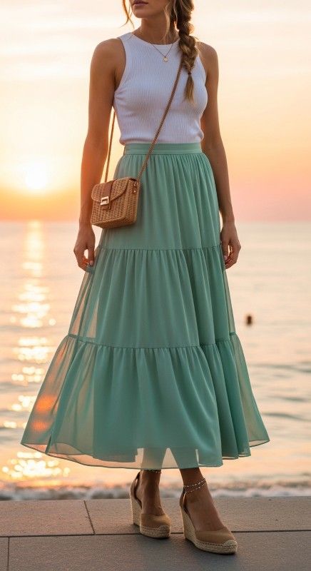 A tiered chiffon maxi skirt in soft mint paired with a fitted ribbed tank creates romantic volume with balanced proportions. The flowing layers add movement and femininity while the fitted top defines your silhouette beautifully. Pair with espadrille wedges and a woven crossbody for coastal-chic styling. Layer delicate anklets and wear hair in loose braids for bohemian refinement. This look captures dreamy summer energy with effortless grace. Perfect for beachside dinners or sunset gatherings.