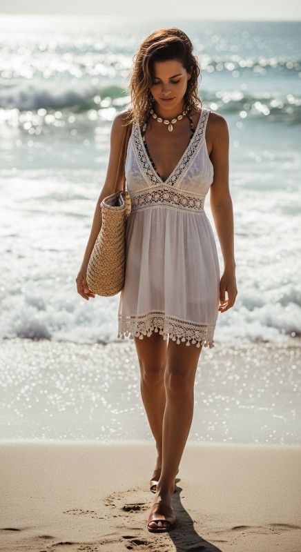 A white crochet-trimmed cover-up dress layered over a simple swimsuit creates bohemian beach elegance. The delicate crochet detailing adds artisanal charm while the loose fit ensures breezy comfort by the water. Style with leather slide sandals and a woven tote for complete coastal styling. Add shell jewelry and beachy waves for authentic vacation vibes. This versatile piece transitions from poolside to beachside cafés effortlessly. Embrace relaxed femininity with this summer essential.
