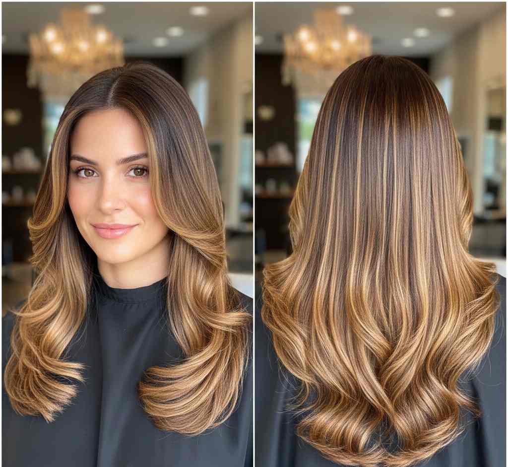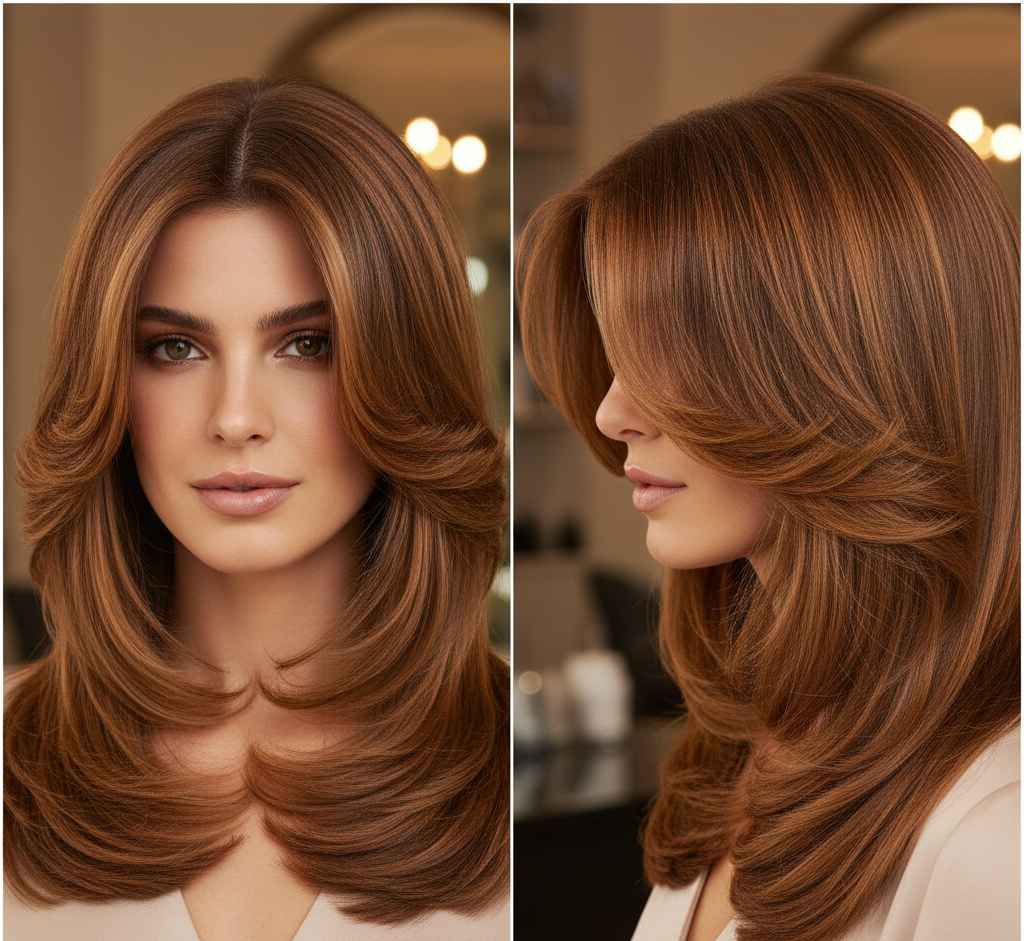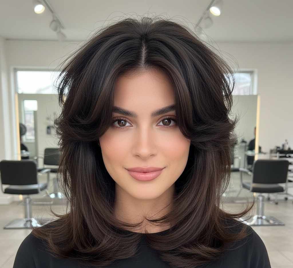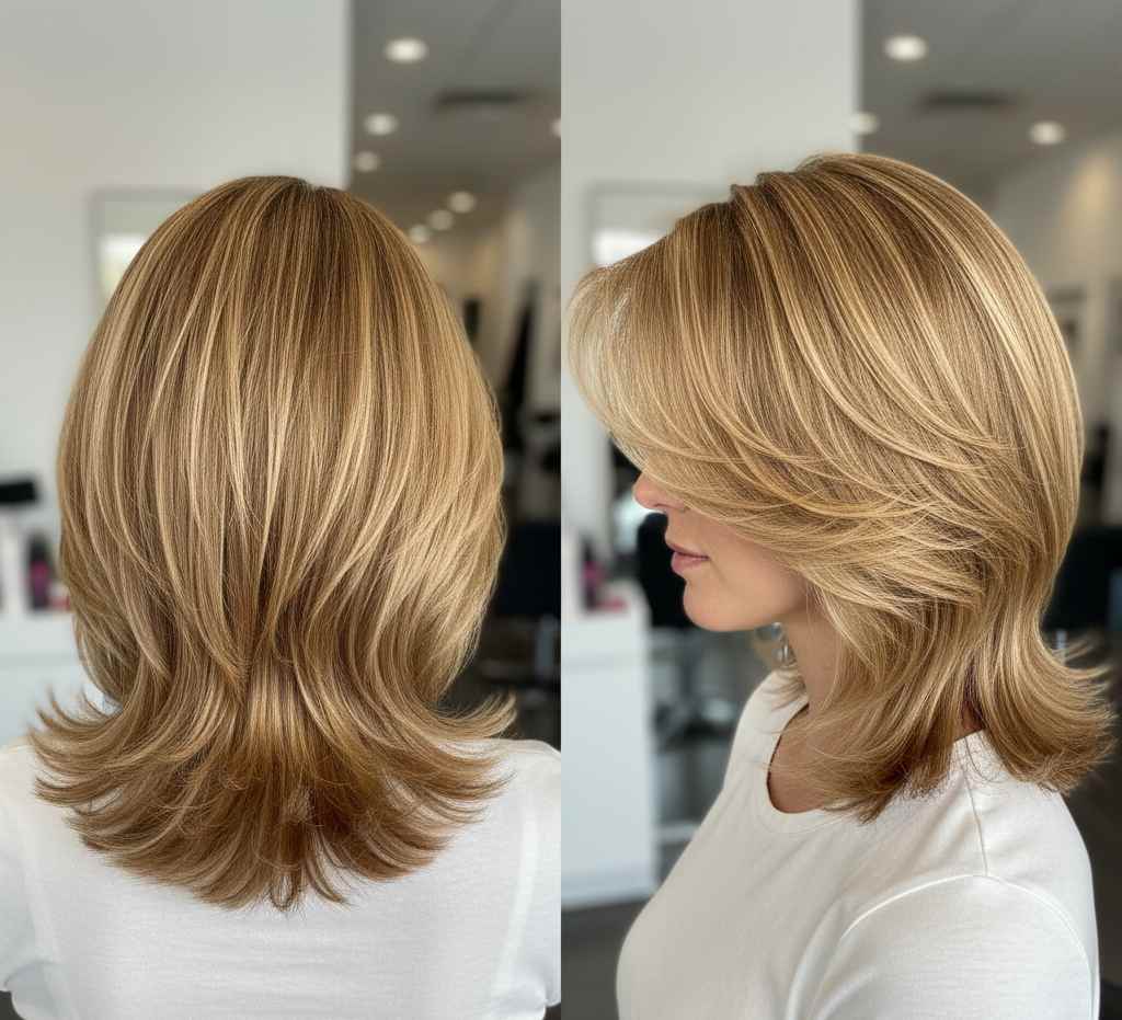 Styling tip: Blow-dry with a round brush, lifting at the roots for maximum volume. The shorter top layers will naturally flip out and create that signature butterfly effect.