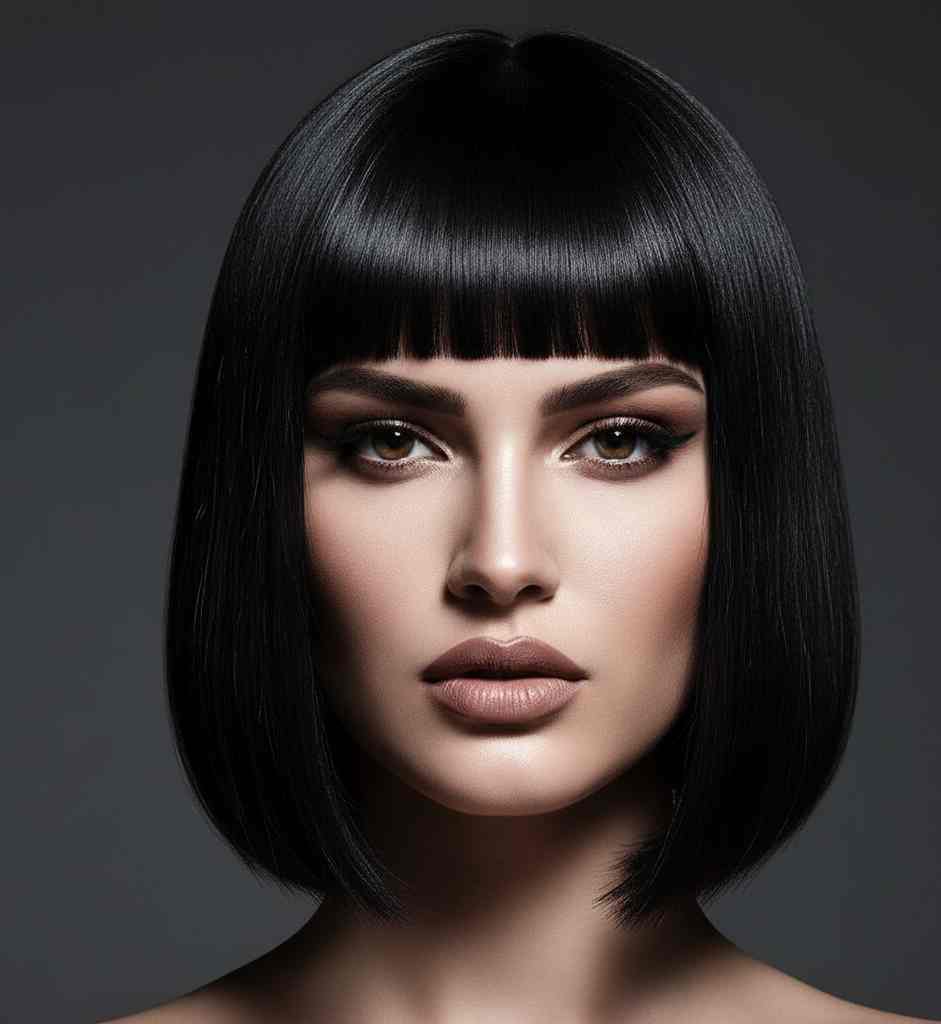 A strong, blunt-cut bob hitting between chin and shoulders, paired with blunt or slightly textured bangs for a bold, fashion-forward statement.