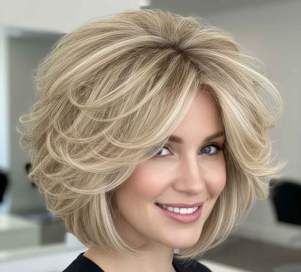 A medium bob cut specifically designed to create maximum volume through strategic layering and cutting techniquesโperfect for fine hair.