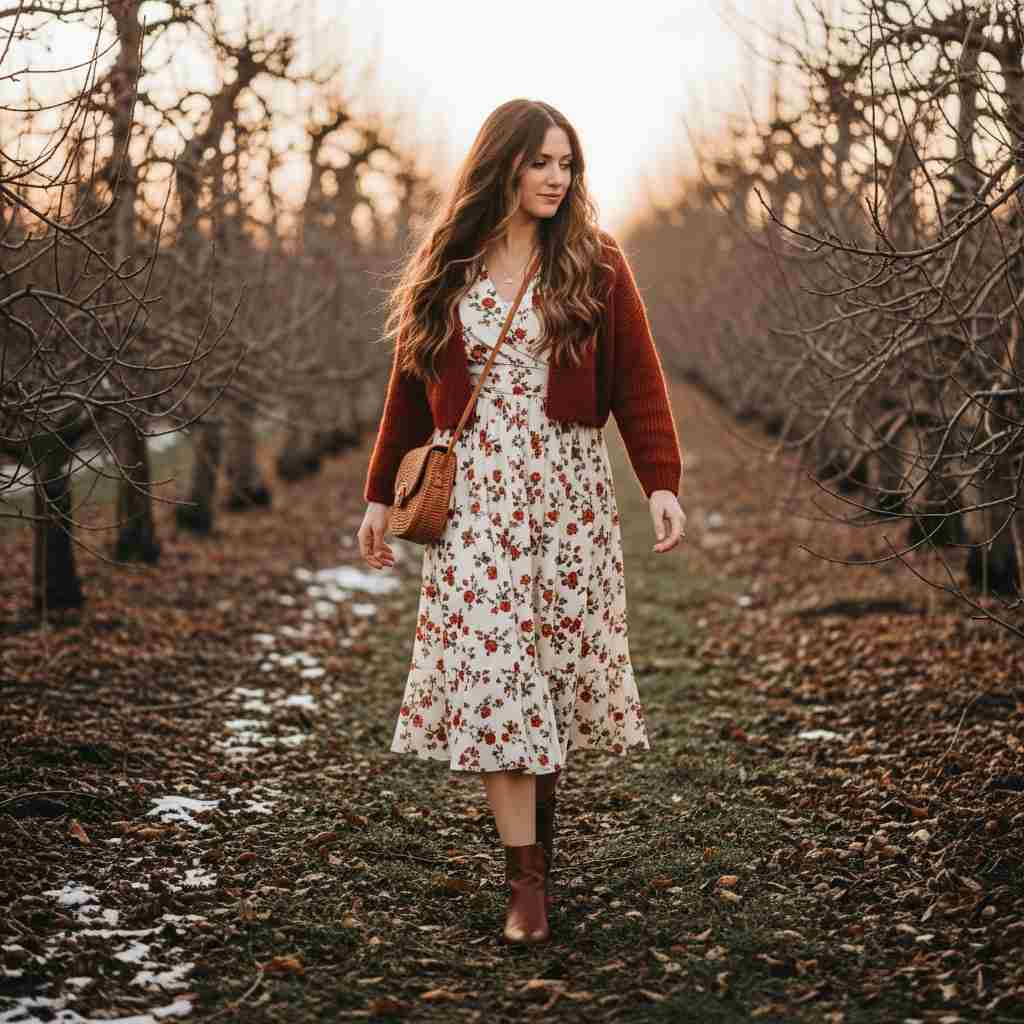 A flowy midi dress with floral or ditsy print paired with a cropped cardigan and ankle boots creates soft, romantic January vibes. Add a woven bag and delicate jewelry for vintage-inspired charm.