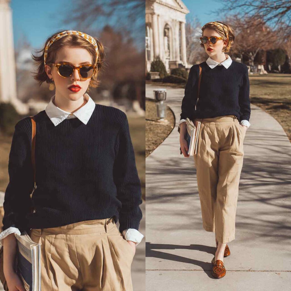 A crewneck sweater in a classic color with the collar of a button-down peeking out, paired with pleated trousers or a plaid skirt creates preppy perfection. Add loafers and a headband.