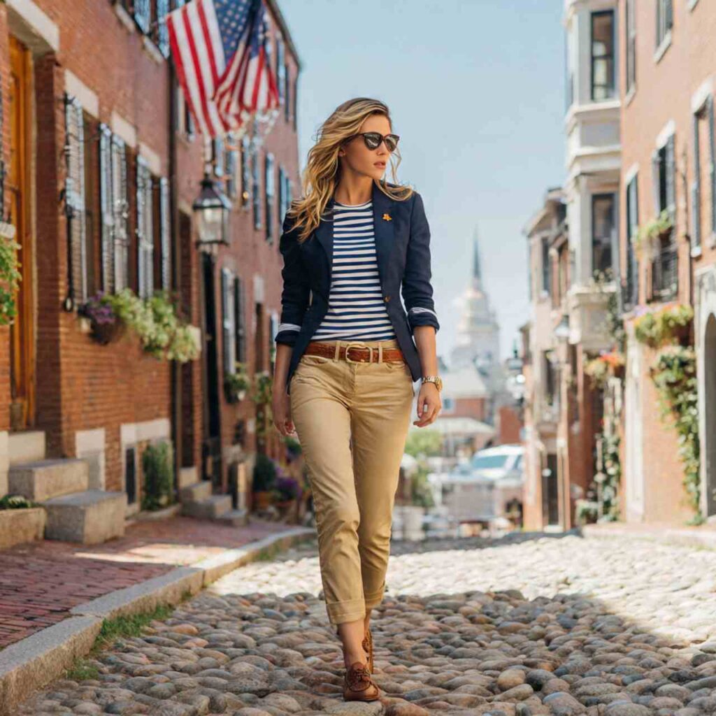 A structured navy blazer over a striped tee with khaki chinos and penny loafers creates East Coast prep. Add a leather watch and minimal accessories.