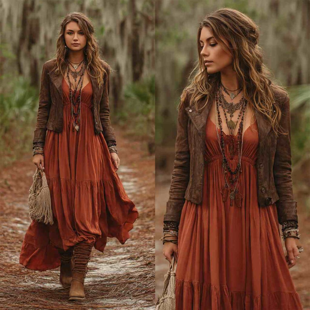 A flowy maxi dress in earth tones paired with a cropped denim or leather jacket creates boho-meets-practical styling. Add flat boots and layered necklaces.