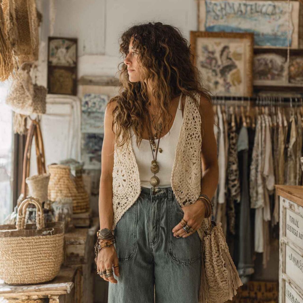 A crochet vest or cardigan worn over a simple tee with vintage-wash jeans creates textured bohemian cool. Add platform sandals or clogs and woven accessories.