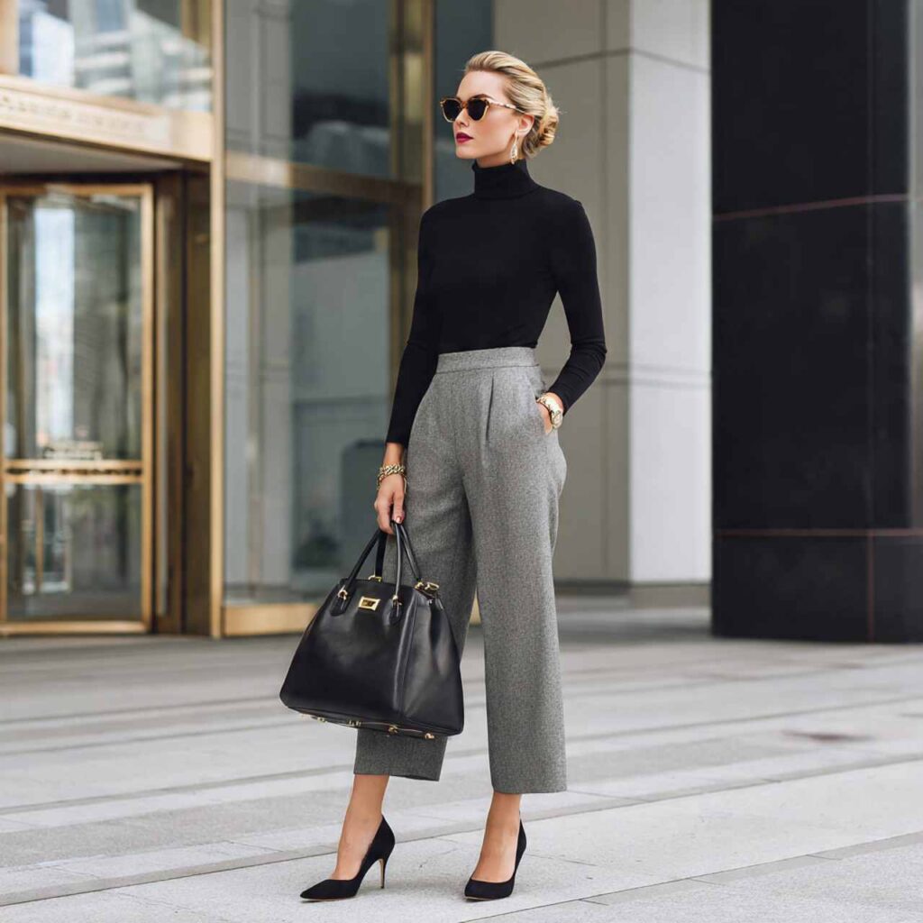 A fine-knit black turtleneck tucked into high-waisted tailored trousers in grey or camel creates timeless sophistication. Add pointed heels and a structured bag.