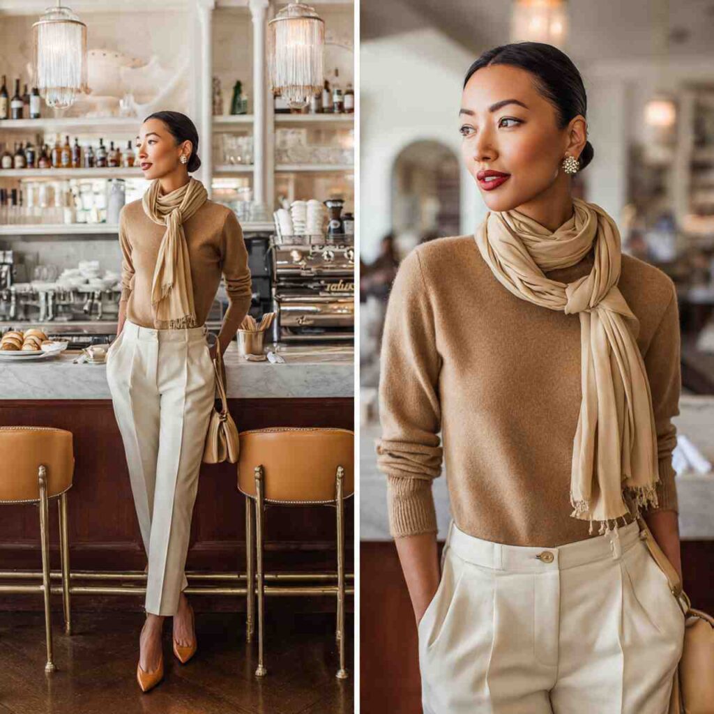 A cashmere sweater and matching or coordinating cashmere scarf with tailored pants creates luxurious simplicity. The texture alone conveys sophistication.