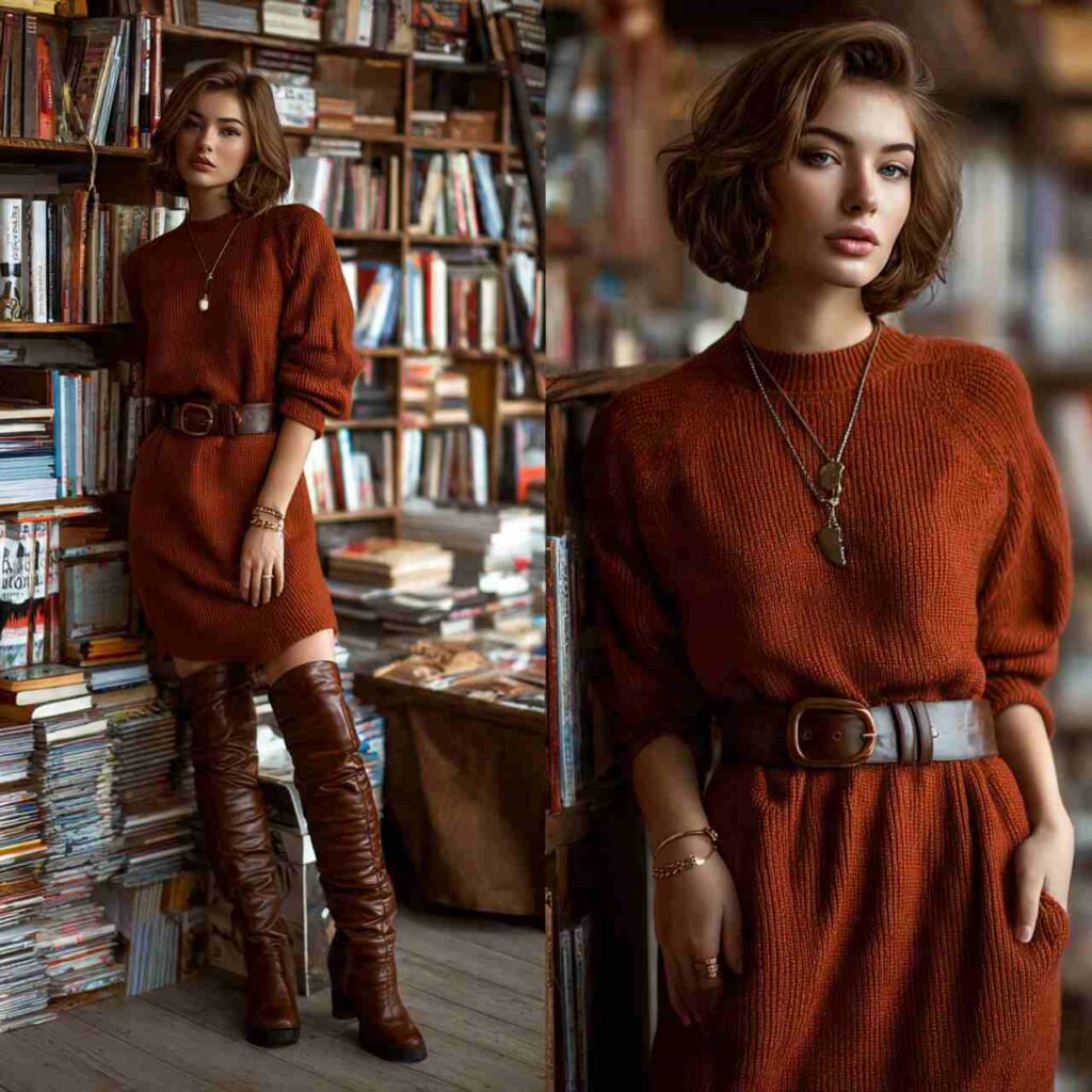 A midi-length sweater dress in a neutral or earth tone with knee-high boots creates one-piece comfort. Add a belt to define waist or leave loose for maximum coziness.