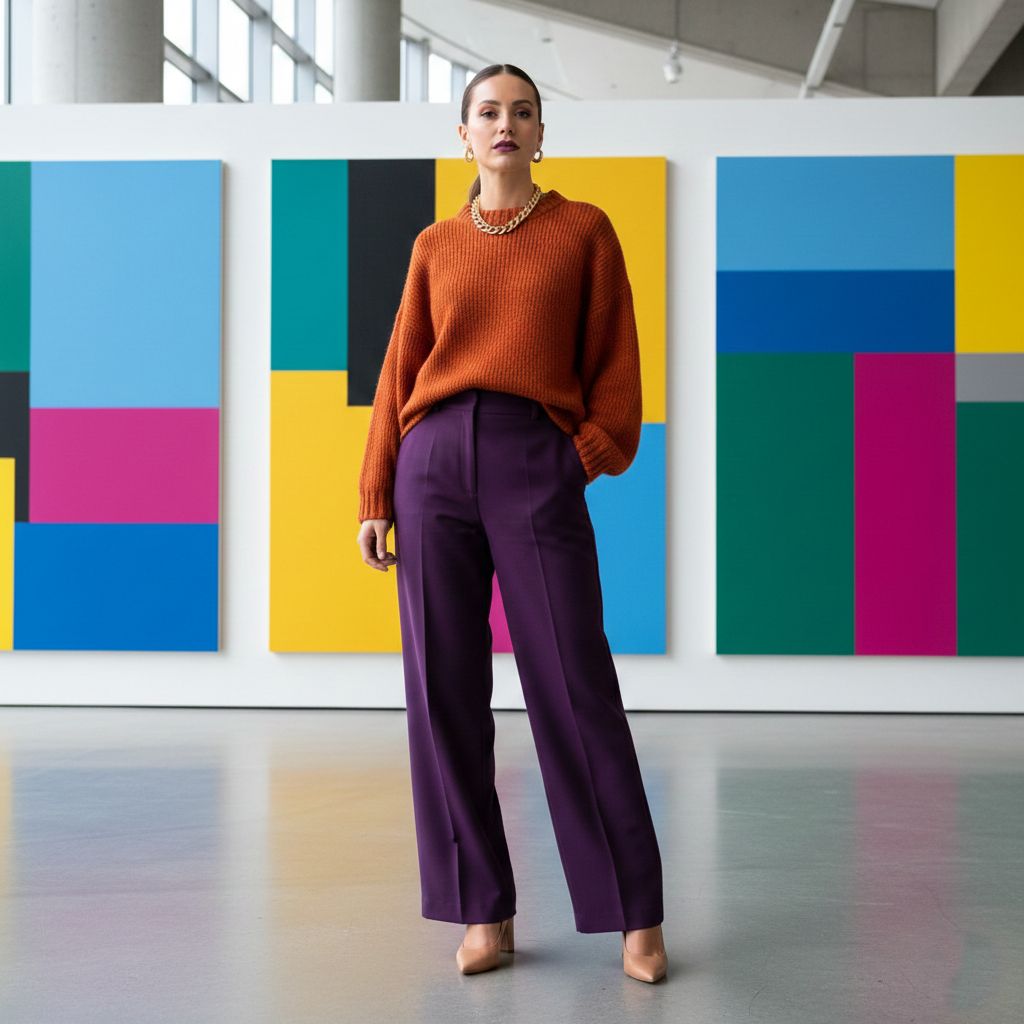 Bold color-blocking orange sweater with purple pants, or green top with red trousersโcreates fearless style. Keep accessories neutral to let the colors shine.