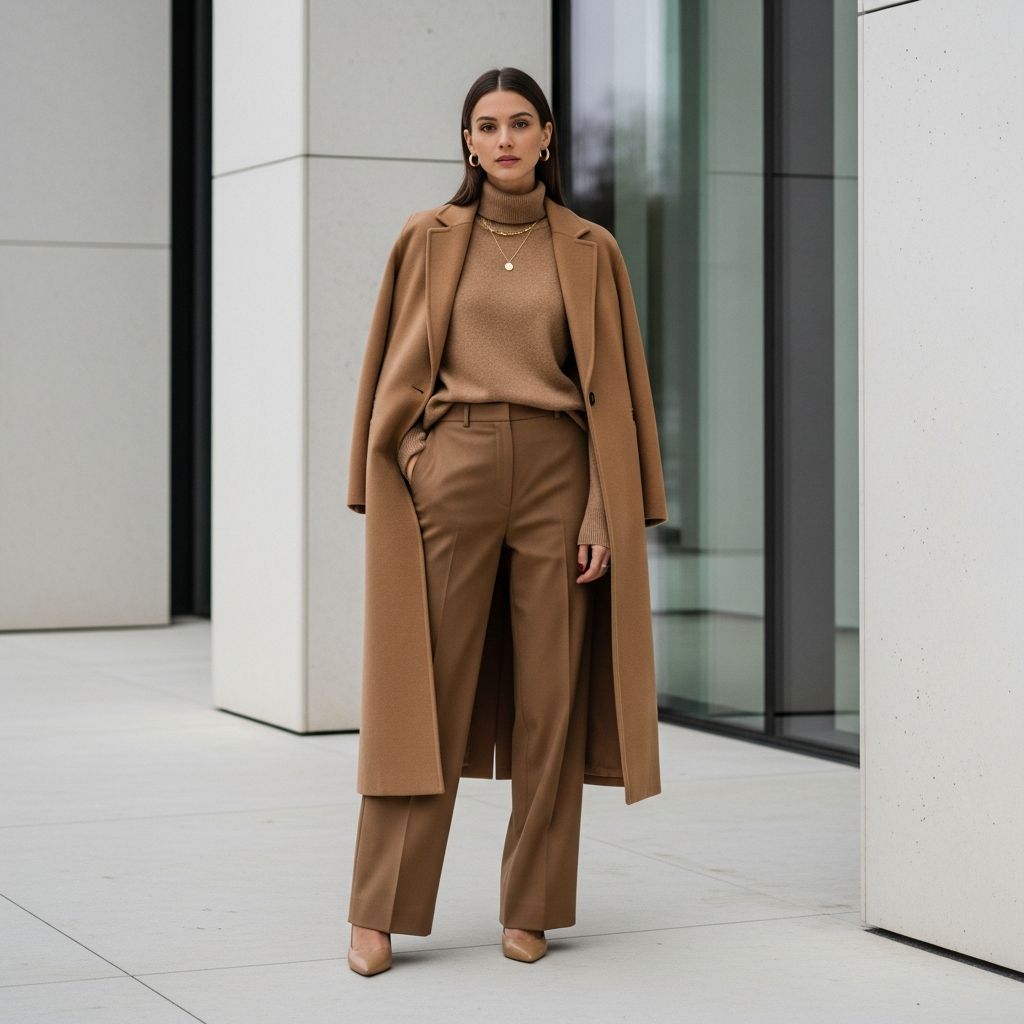 Head-to-toe camel camel turtleneck, camel trousers, and camel coat in varying shades creates sophisticated monochrome. Add minimal gold jewelry and nude heels.