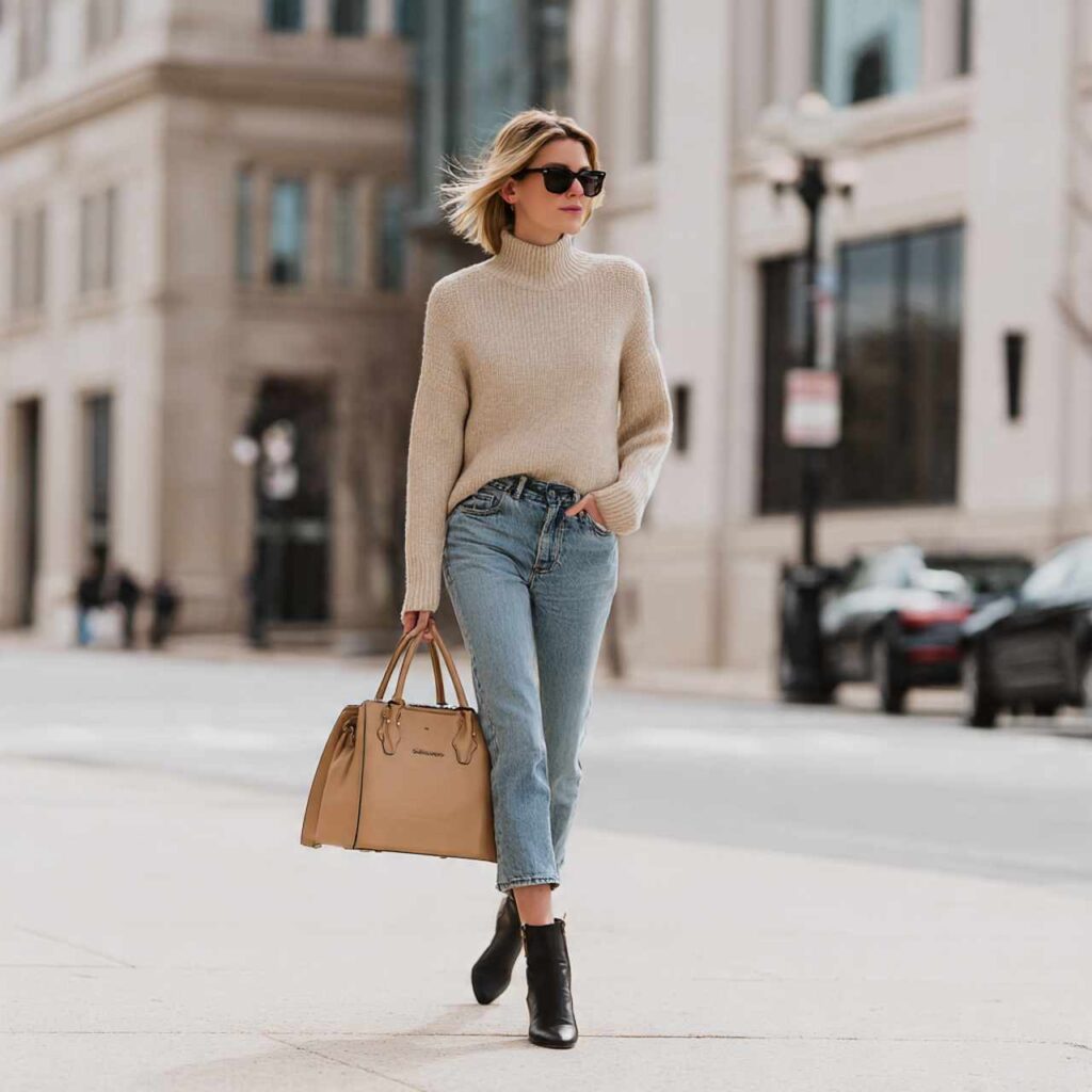 A perfectly fitted beige or oatmeal turtleneck with straight-leg jeans and sleek boots creates understated ease. Add a structured leather bag and minimal accessories.
