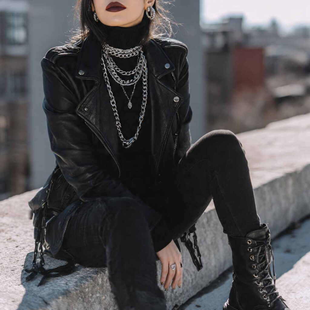 Black leather jacket over a black turtleneck with black jeans and combat boots creates monochrome edge. Add silver jewelry and dark lipstick for extra attitude.