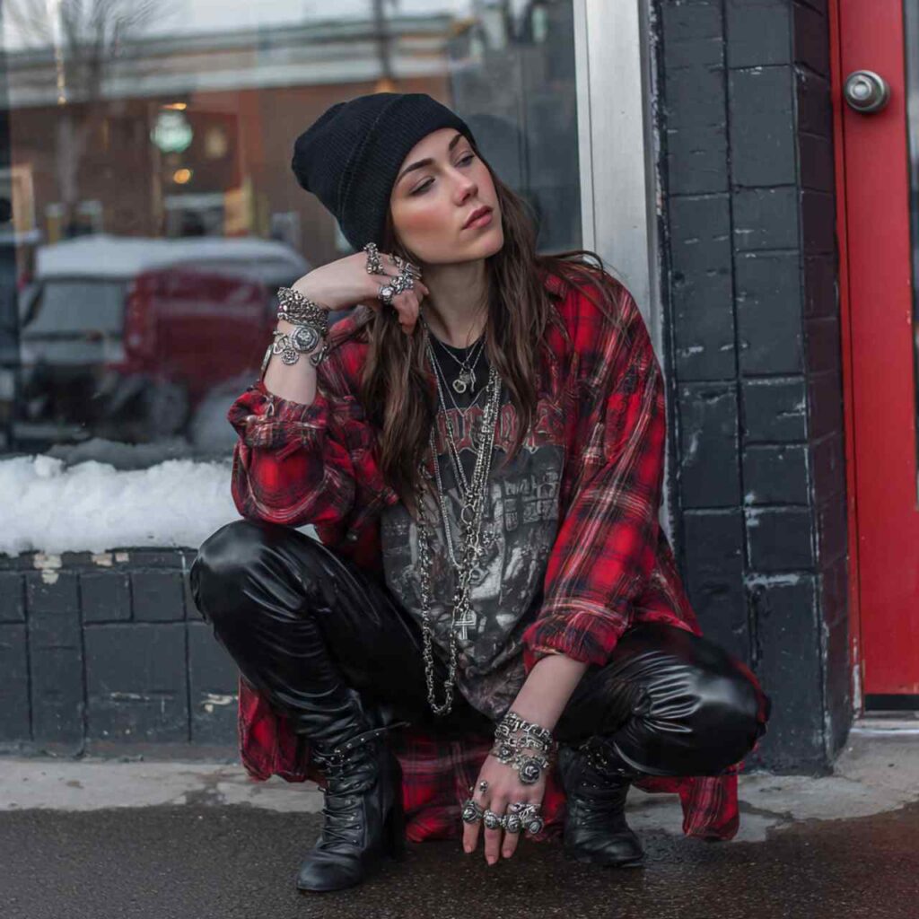A plaid flannel shirt worn open over a band tee with leather pants creates grunge-inspired cool. Add ankle boots and layered silver jewelry.