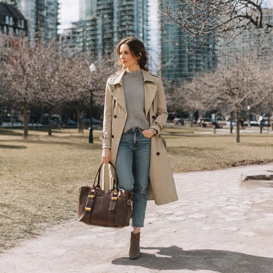 Classic layering foundation. Lightweight trench coat over medium-weight sweater and jeans creates adaptable outfit for fluctuating temperatures.