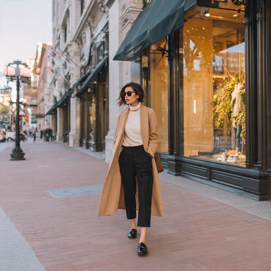Proportional transitional styling. Ankle-length trousers with longer coat creates interesting silhouette while accommodating weather changes.