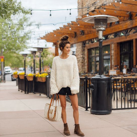 Cozy casual transition. Chunky oversized sweater over bike shorts with ankle boots creates comfortable layered look for unpredictable days.