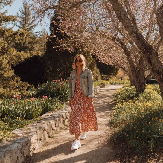 Bohemian transitional ease. Flowing maxi dress with jean jacket and sneakers combines coverage with breathability and casual comfort.