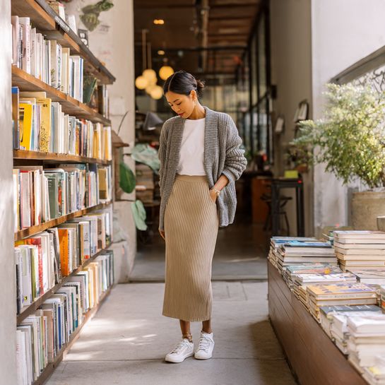 17. Knit Skirt with T-Shirt and Cardigan