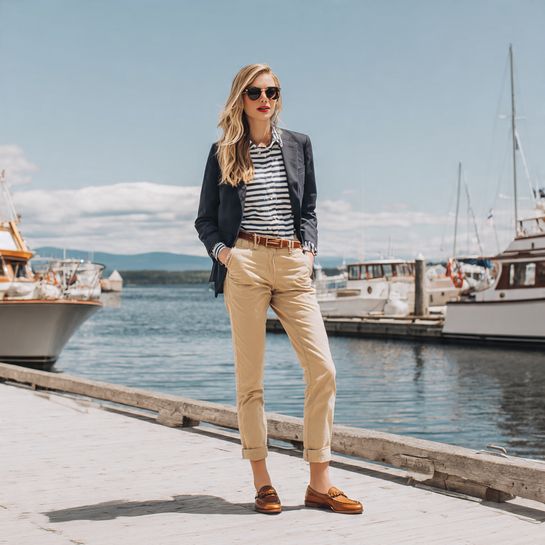 Preppy transitional polish. Neutral chinos with striped long-sleeve tee and blazer creates put-together look working across settings.