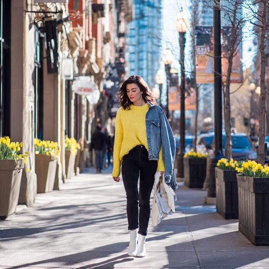 Winter base with spring accent. Black jeans provide winter familiarity while colorful lightweight sweater signals spring optimism.