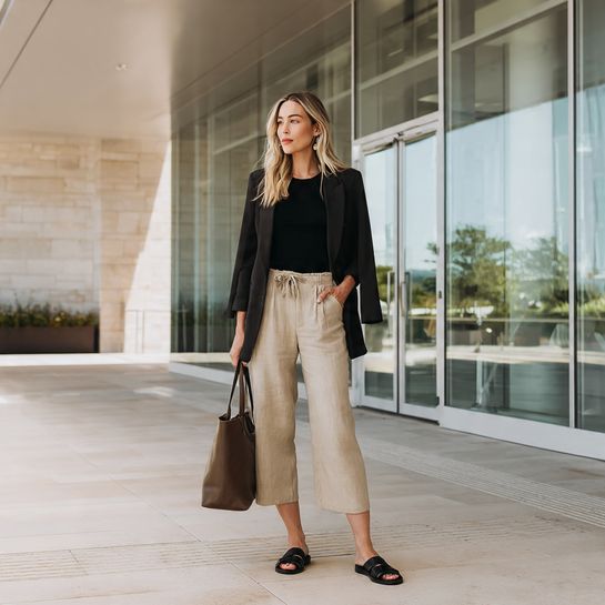 Relaxed transitional proportions. Flowing wide-leg pants with fitted tee and structured jacket balances comfort and polish.