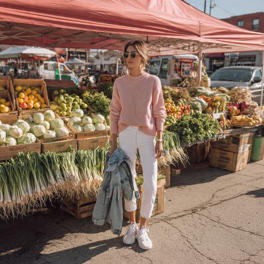 4. Light Sweater with White Jeans and Sneakers