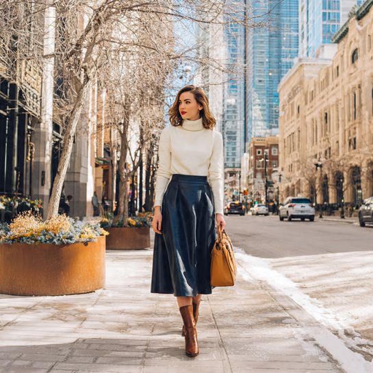 Transitional silhouette. Midi skirt in heavier fabric paired with fitted sweater and boots works through temperature changes while remaining polished.