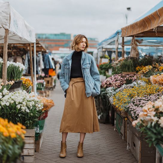 8. Denim Jacket with Turtleneck and Skirt